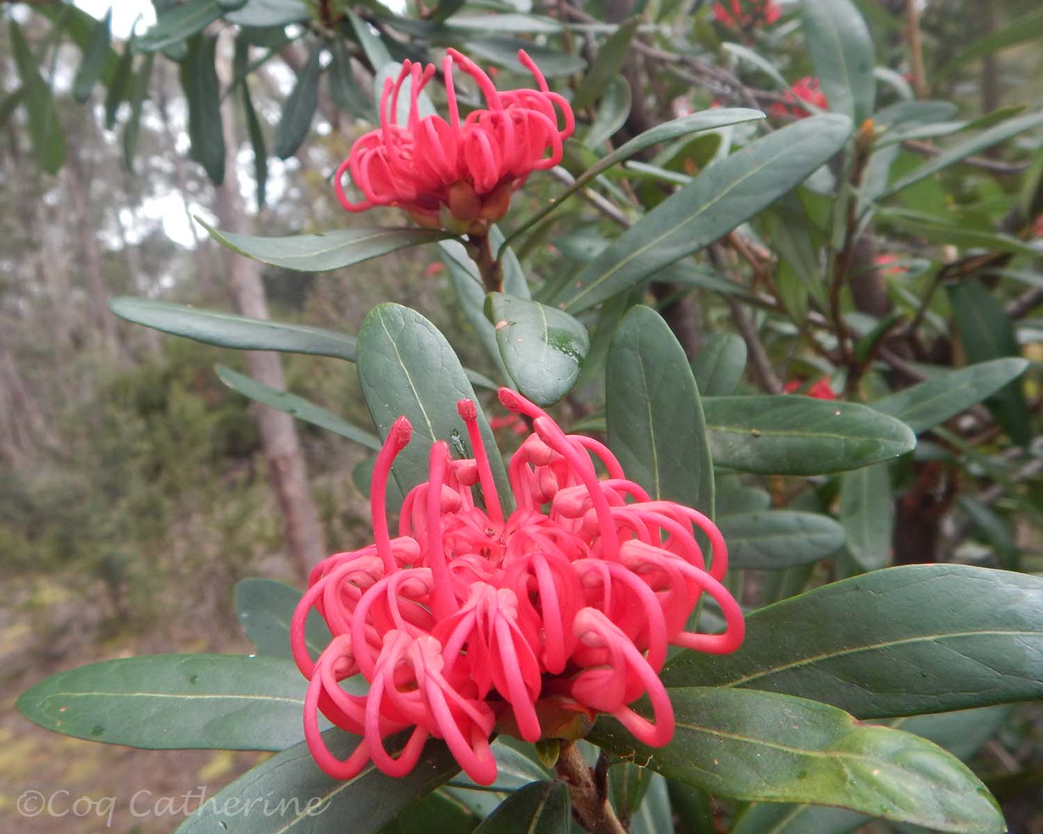 C’est le plus profond lac d’Australie, avec 167m de fond. Nous débutons la marche dans une belle forets d’eucalyptus, avec quelques géants et je surprends un « Tiger Snake sur le chemin », qui heureusement s’enfuit devant moi. Puis c’est la rêverie de toutes ces fleurs et senteurs… avec les boucles blanches des mountain needlebush, de beaux arbres couverts de waratah rouges, au sol je découvre de petites orchidées des sous-bois, puis des scoparias plus claires dans la plaine, les cônes séchés de Banksia qui ressemblent aux petites chouettes camouflées dans les arbres, des mountain pinkberry…. le plus souvent ces plantes sont endémiques à la Tasmanie.