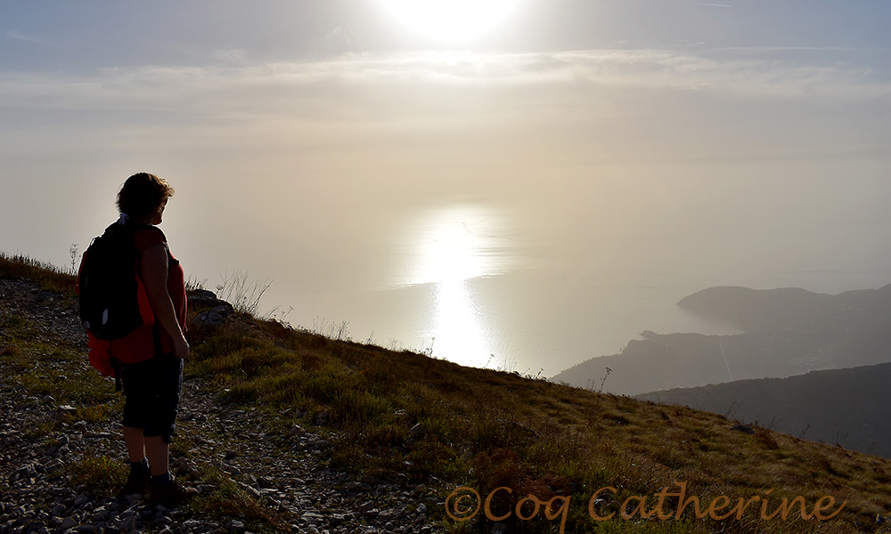 Après environ 1h30 de marche, nous atteignons le sommet, un point de vue exceptionnel sur la région, avec un panorama inoubliable. À l’abri du vent, nous prenons le temps de savourer le spectacle qui s’offre à nous, un moment de contemplation. La mer Adriatique, baignée d’une lumière jaune dorée, semble s’étendre à l’infini, un tableau magnifique.