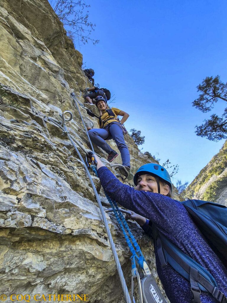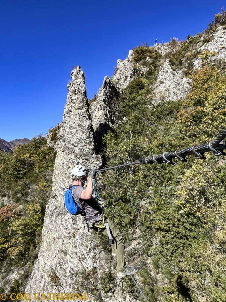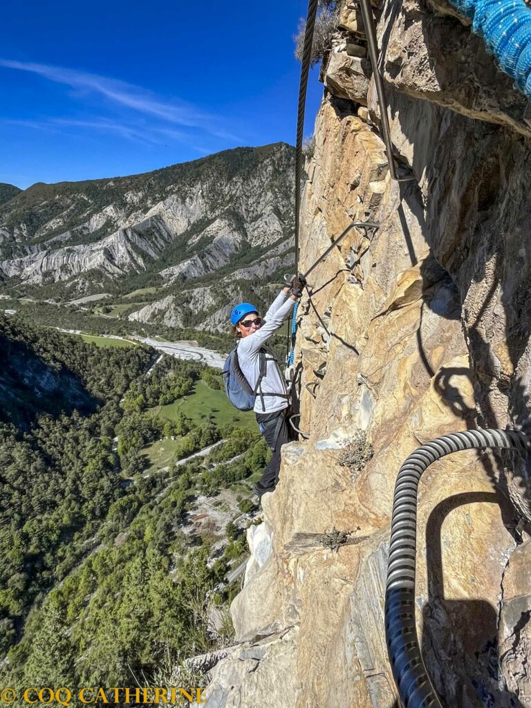 De plus, de par son dénivelé et la verticalité de l’itinéraire, cette via ferrata nécessite une bonne condition physique et une certaine expérience de la verticalité. Car ici, le tracé alterne entre des passages aériens et des passages en surplomb assez physiques. Le ton est donné dès le début avec le franchissement du Mur « Haute Bléone », qui mène à la suite du parcours !