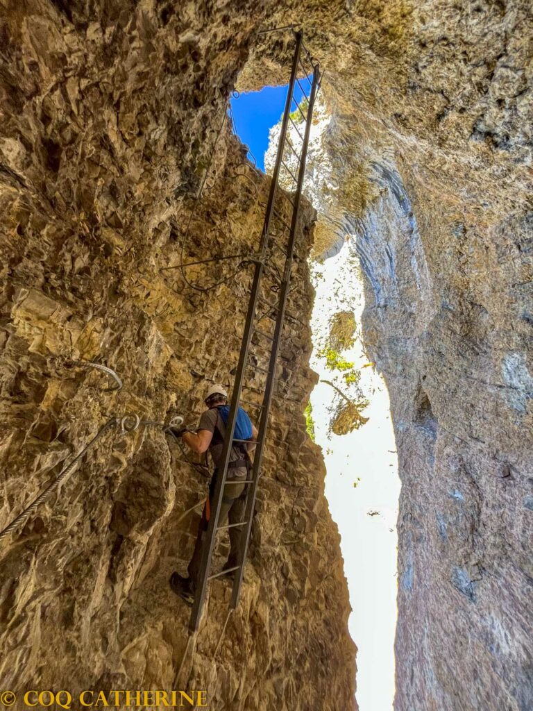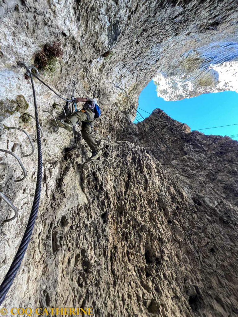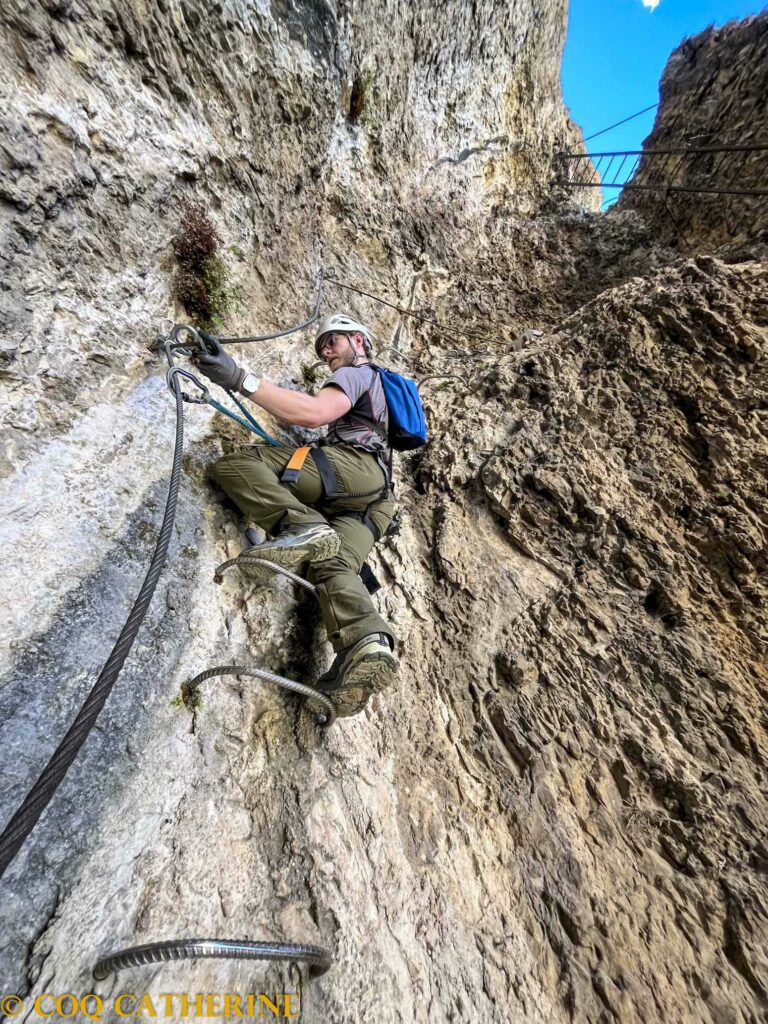 Puis j’arrive sur une large vire de repos et c’est aussi ici que l’on peut soit sortir de la Via Ferrata ou continuer, avec deux variantes au choix.