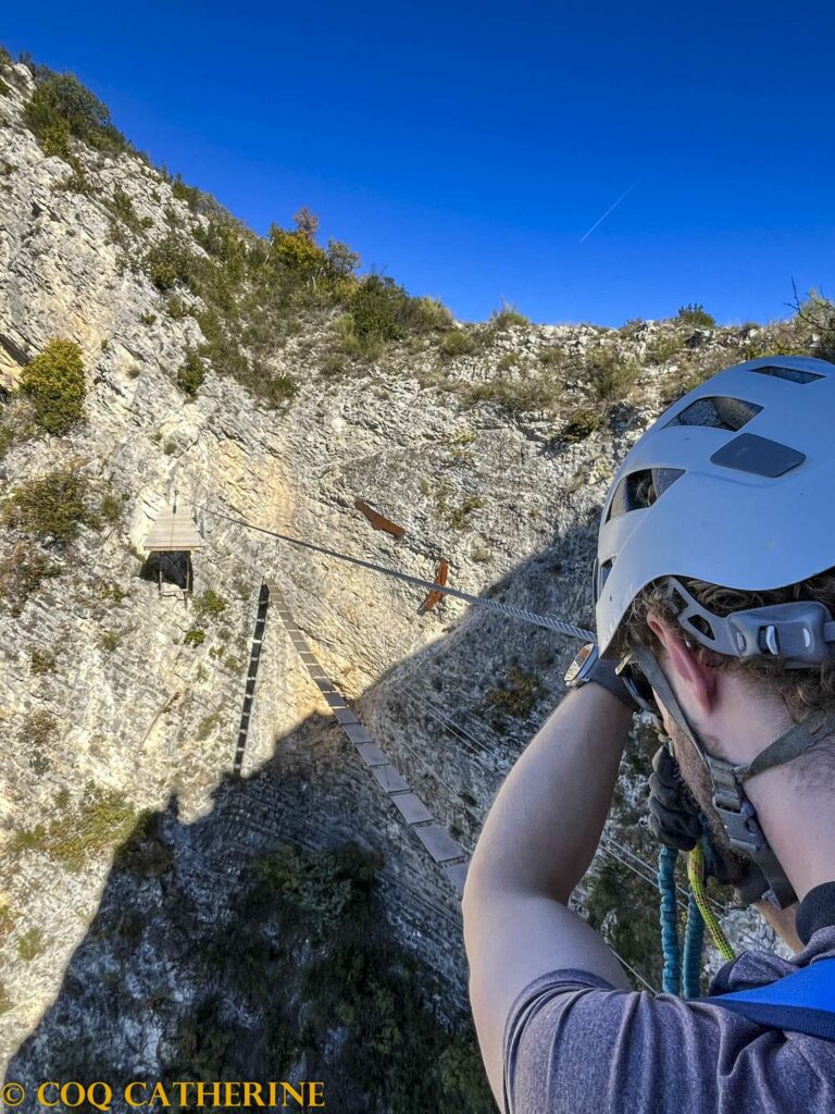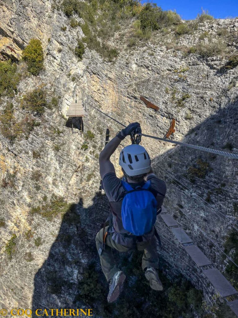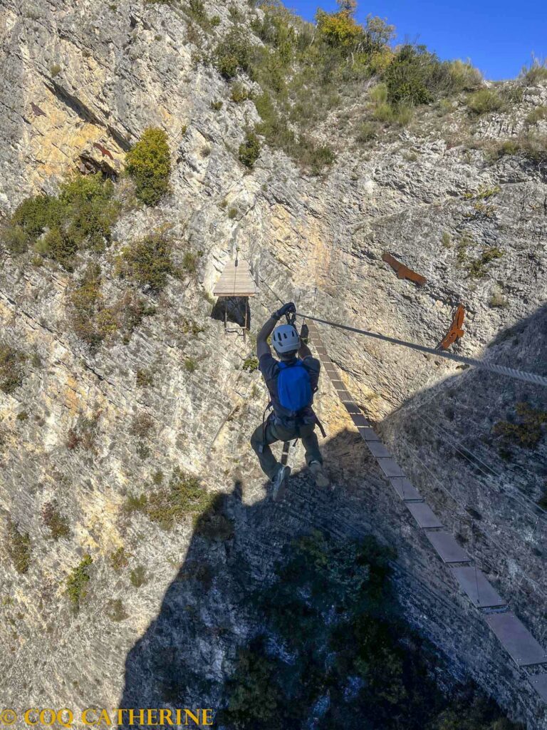 Ensuite je grimpe l’Echelle de la Grande Baume avant de traverser par le Pont Népalais de l’Aigle. Puis nous traversons par la poutre aux Hirondelles pour rejoindre le parcours des Vautours. Ce passage est plus impressionnant que difficile et l’ambiance y est extraordinaire !C’est pourquoi, je vous recommande vraiment cette première section pour vous imprégner du vide !