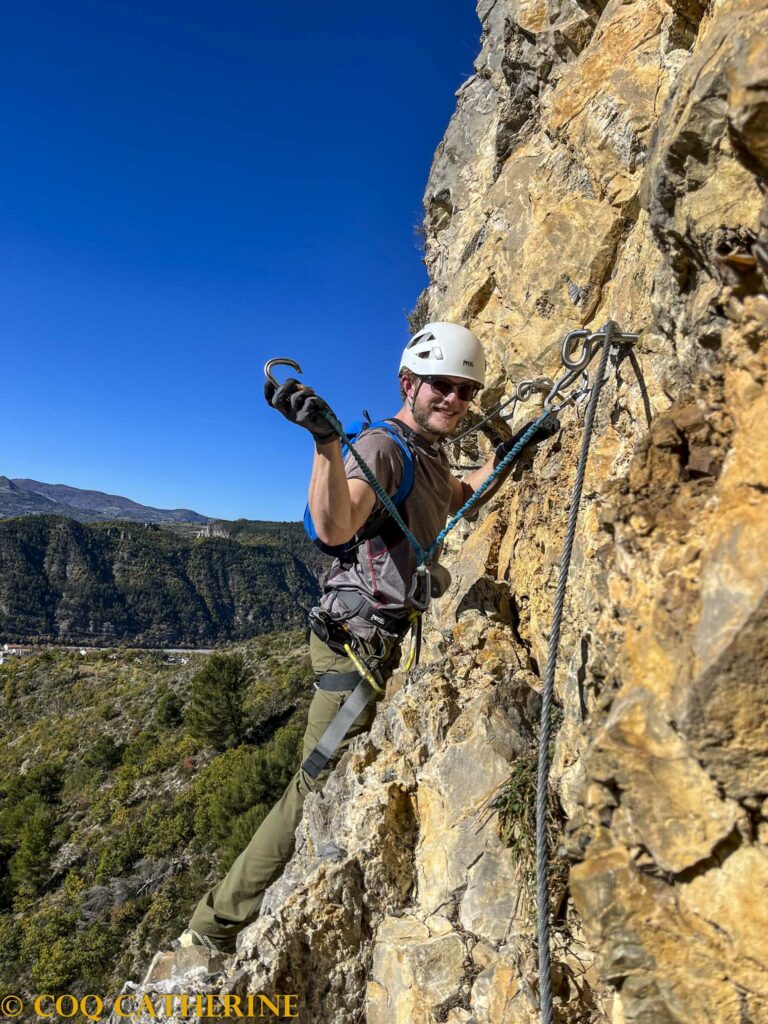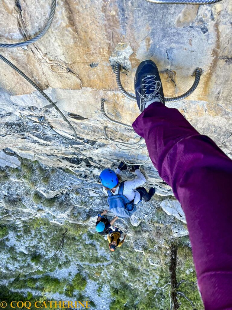La via ferrata se déroule sur quelques centaines de mètres de paroi calcaire, avec des échelles, barreaux, traversées, poutres et même une tyrolienne (qui peut toutefois être contournée). Pour cette aventure, je suis accompagnée de Justin, amateur d’escalade sur bloc.