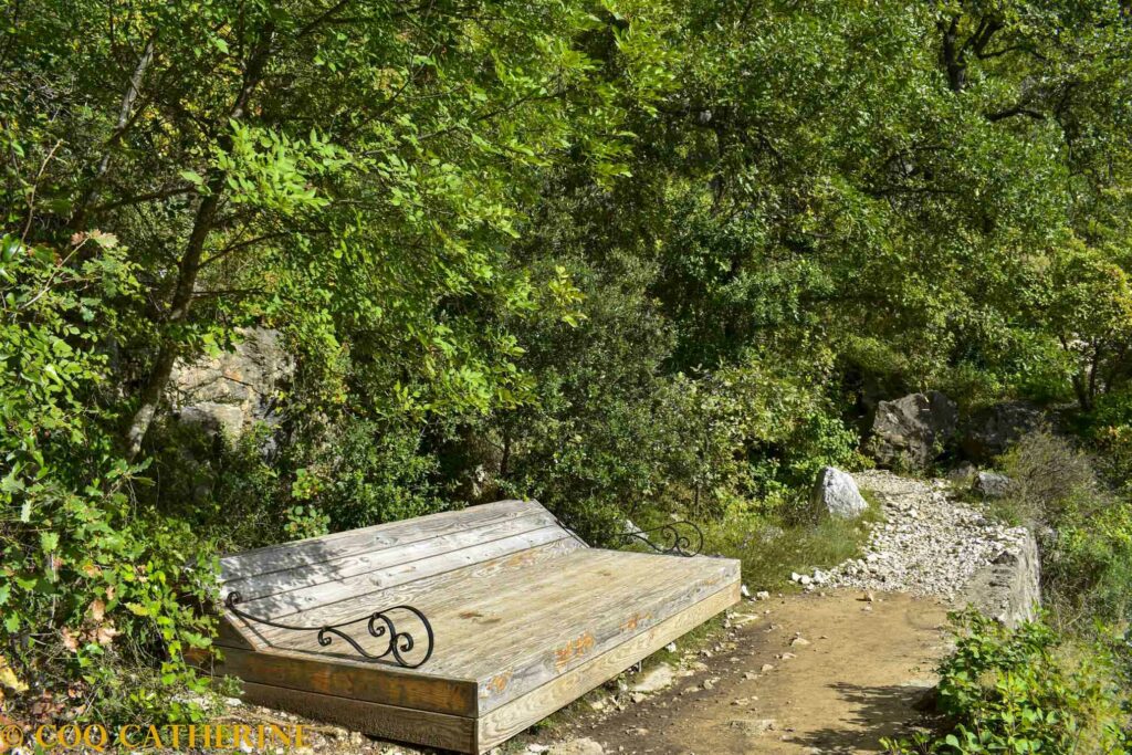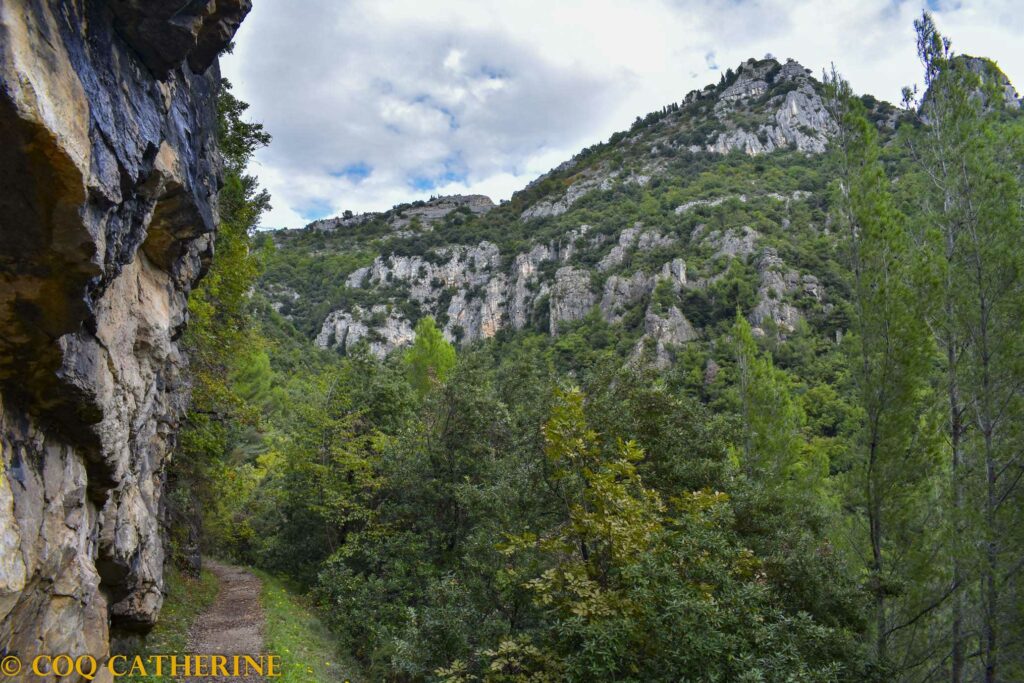 Lorsque j’arrive au canal du Loup, je continue à droite, le GR51. Cette section toujours ombragée est en pente douce et permet de rejoindre la passerelle sur le Riou Gourdon. Alors le sentier grimpe doucement pour rejoindre l’aqueduc du Foulon. Je vous recommande de faire une pause sur le grand banc et de vous rafraichir avant d’attaquer la montée raide et ensoleillée du sentier du Paradis.