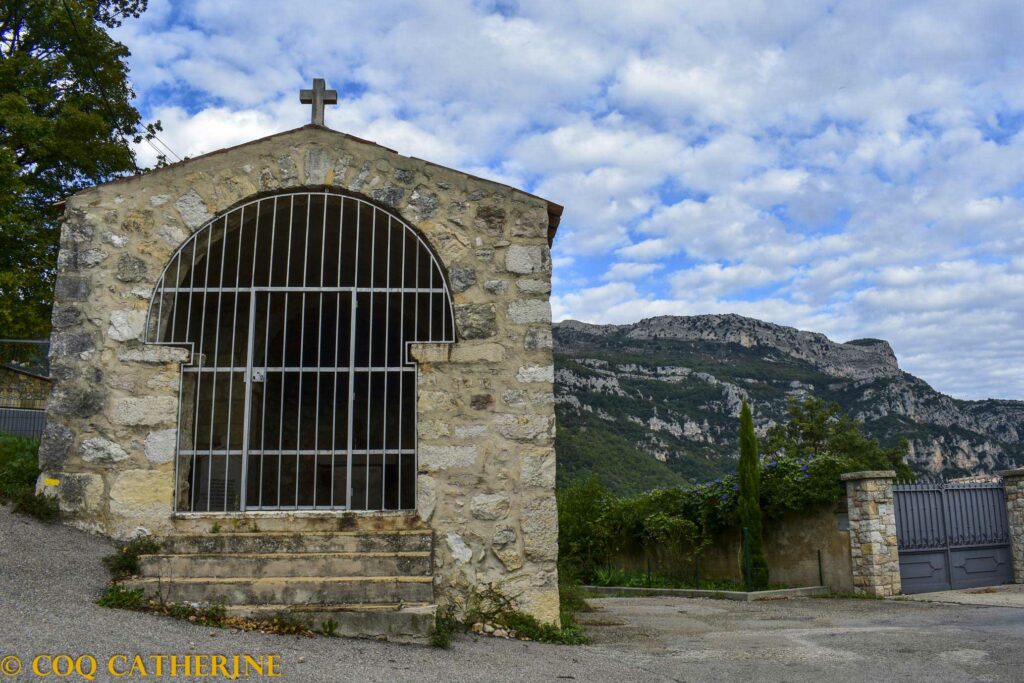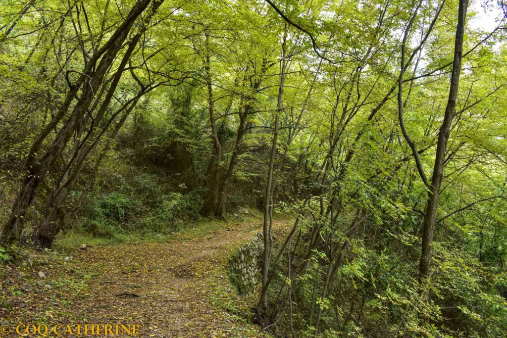 Ensuite je continue à pied en longeant la route par le chemin de Bessurane jusqu’à la chapelle Saint-Claude. Et je prends à gauche sur chemin qui longe les clôtures et les maisons en direction du canal du Loup. Ce sentier ombragé, grimpe pour rejoindre le GR51.