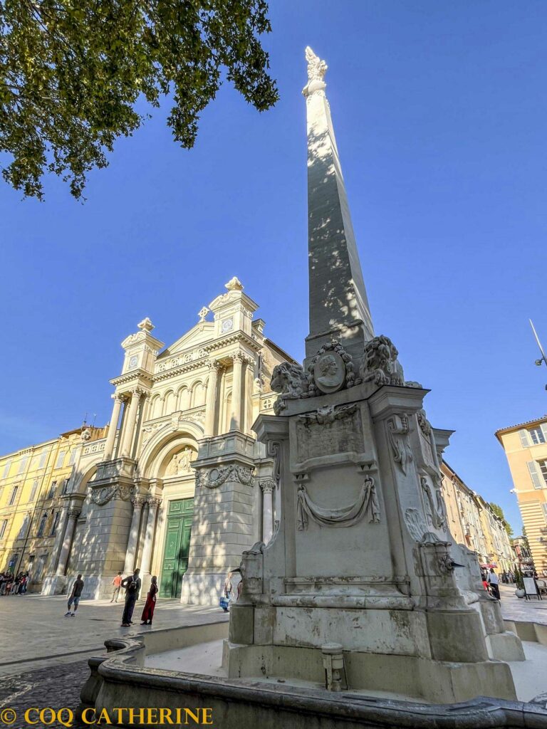 La place des Prêcheurs est située entre le quartier médiéval et la nouvelle ville. Cette grande place accueil le grand marché d’Aix, les mardis, jeudis et samedis matin. Au centre, la fontaine monumentale, face au couvent des Prêcheurs, est surmontée d’un obélisque et d’un aigle qui tient le monde. Autour, la place est bordée d’Hotels particuliers dont l’Hôtel d’Agut avec ses Atalante qui ornent le portail.