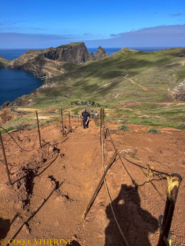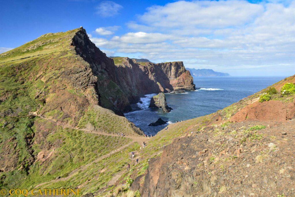 La randonnée vous emmène sur cette péninsule étroite qui s’avance dans l’océan comme la queue d’un dragon. Les formations géologiques sont fascinantes : on voit les strates de lave et des alternances de roches colorées. Le contraste entre la roche rouge, l’écume blanche des vagues déchaînées et le bleu profond de l’océan est un paradis pour les photographes. Par temps clair, on aperçoit les îles Desertas au loin.